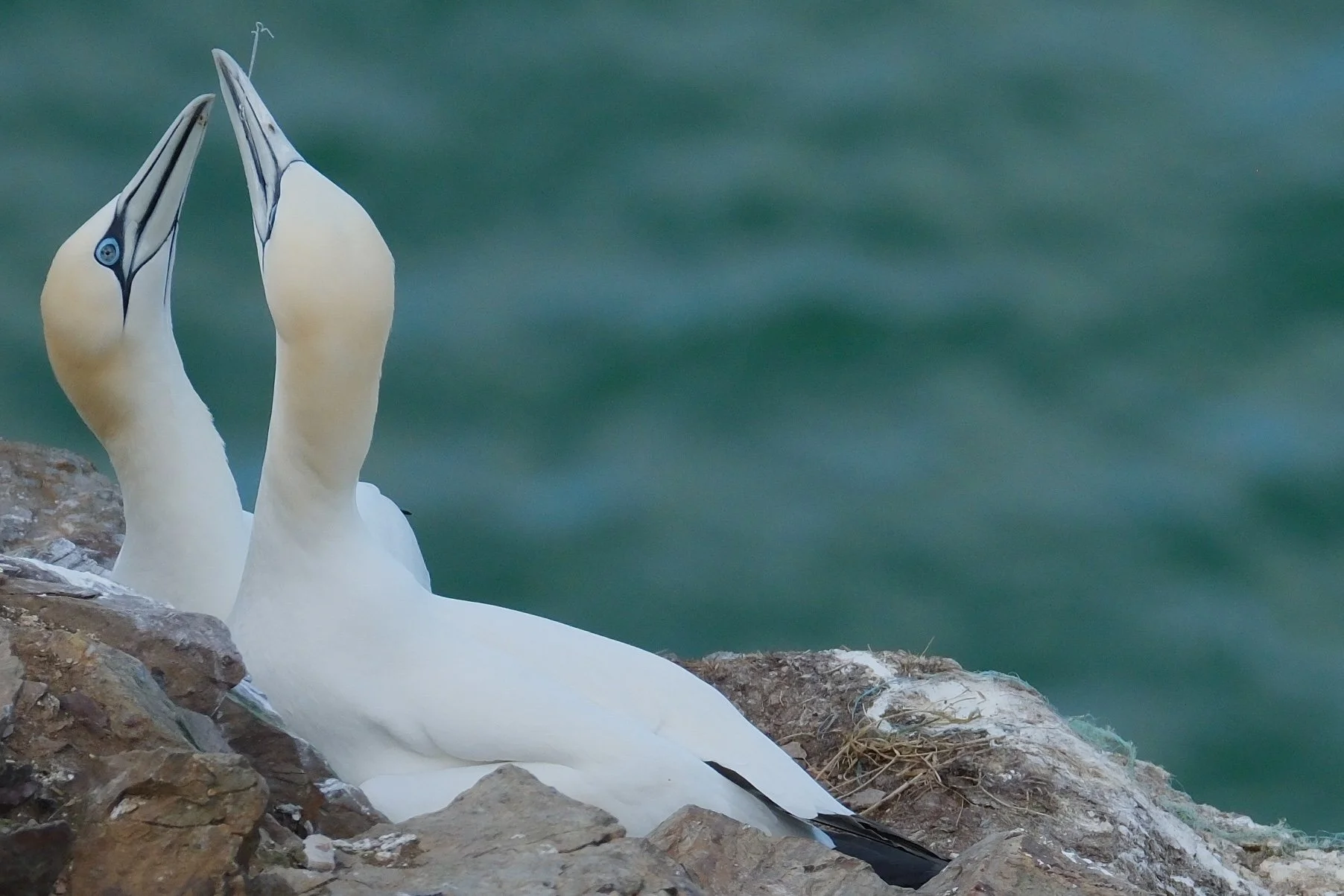 Courtship bill tapping between gannet pair. It seems that the bird on the right has fishing line in its mouth.