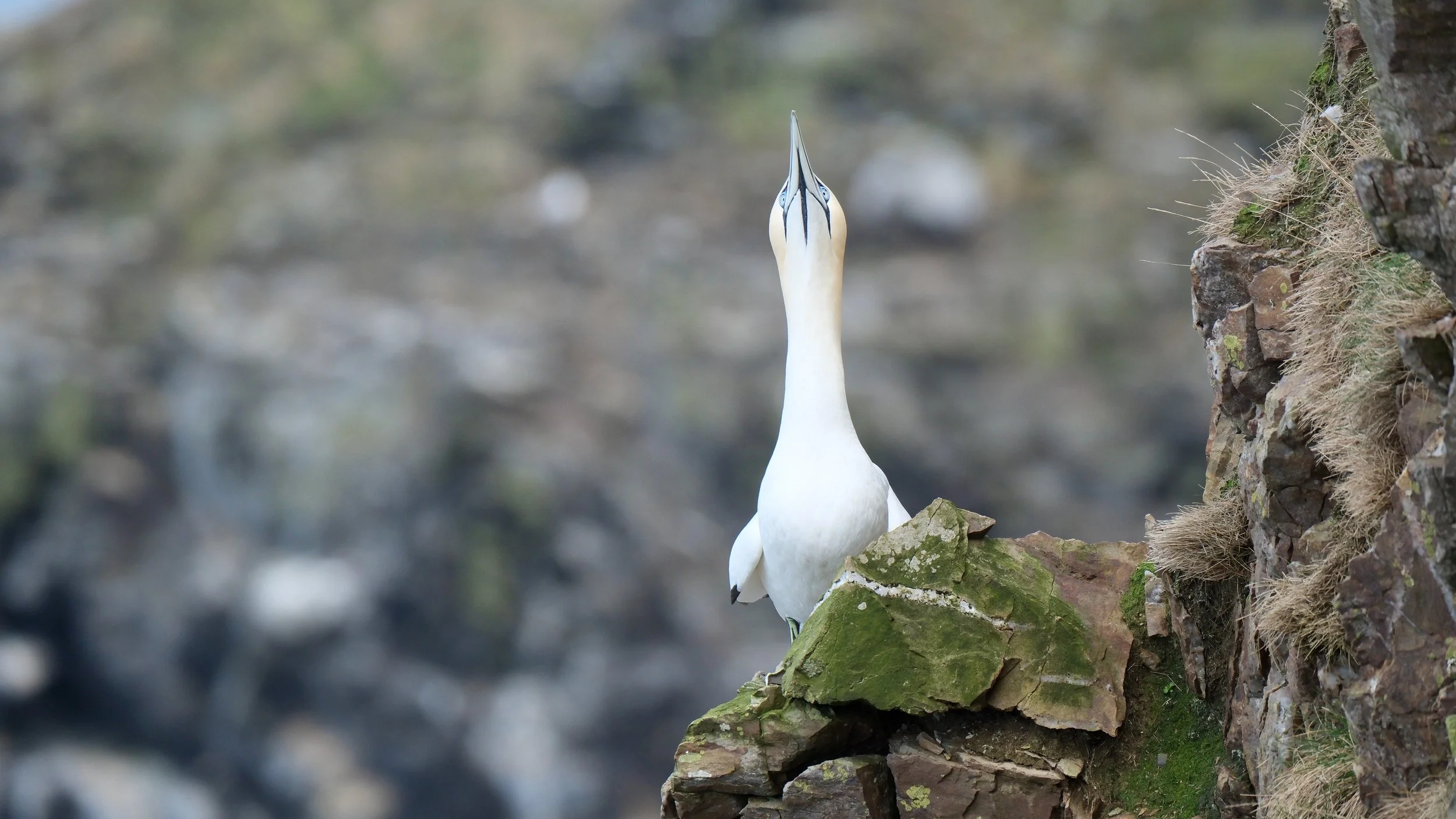 Troup Head, Scotland’s only mainland gannet colony, held large numbers of birds across the ledges today. Many pairs were already formed, standing close together and showing early courtship behaviours such as bill tapping, fencing, and mutual preening. The ledges are narrow and exposed, yet the birds move with complete confidence.