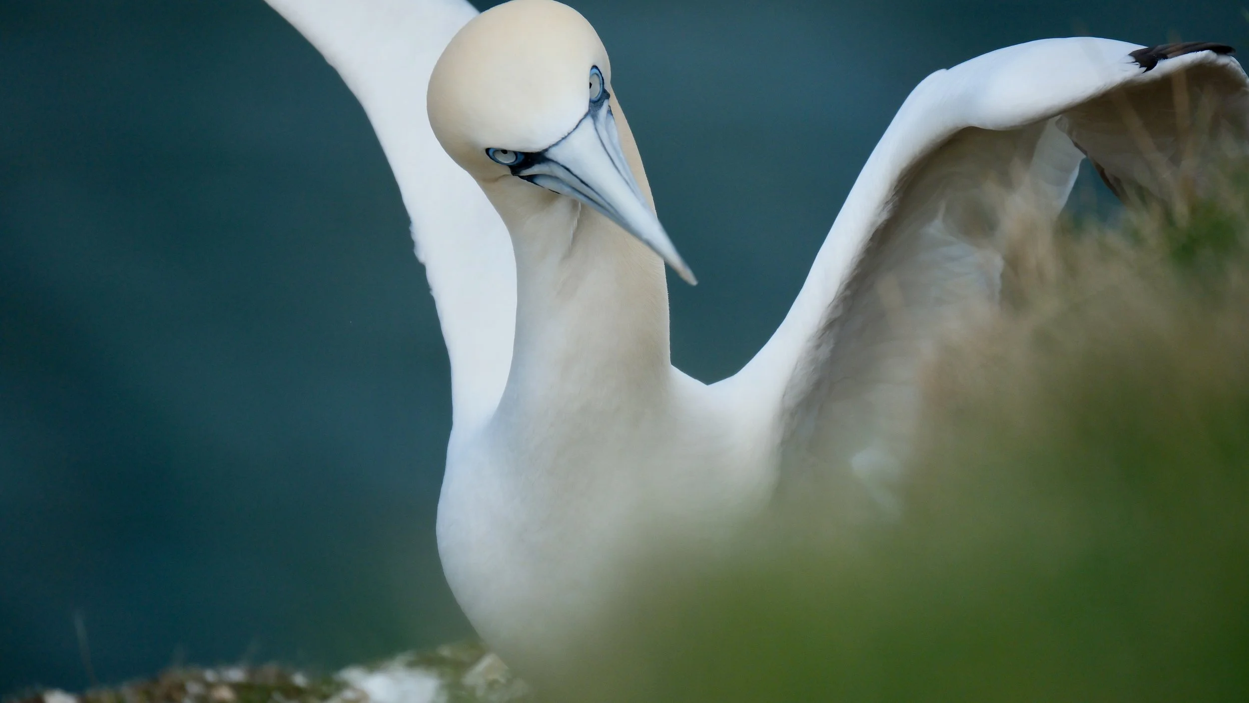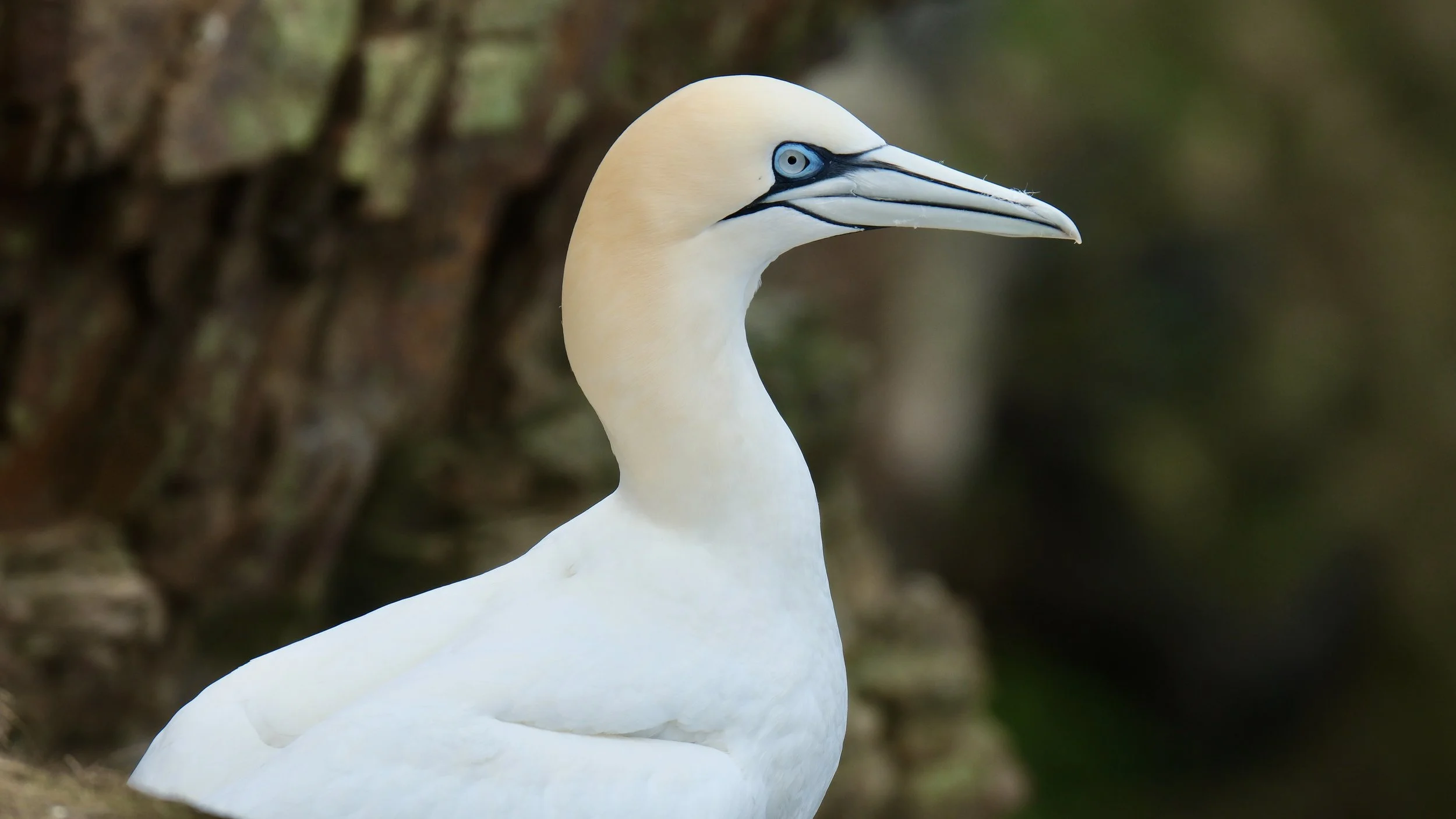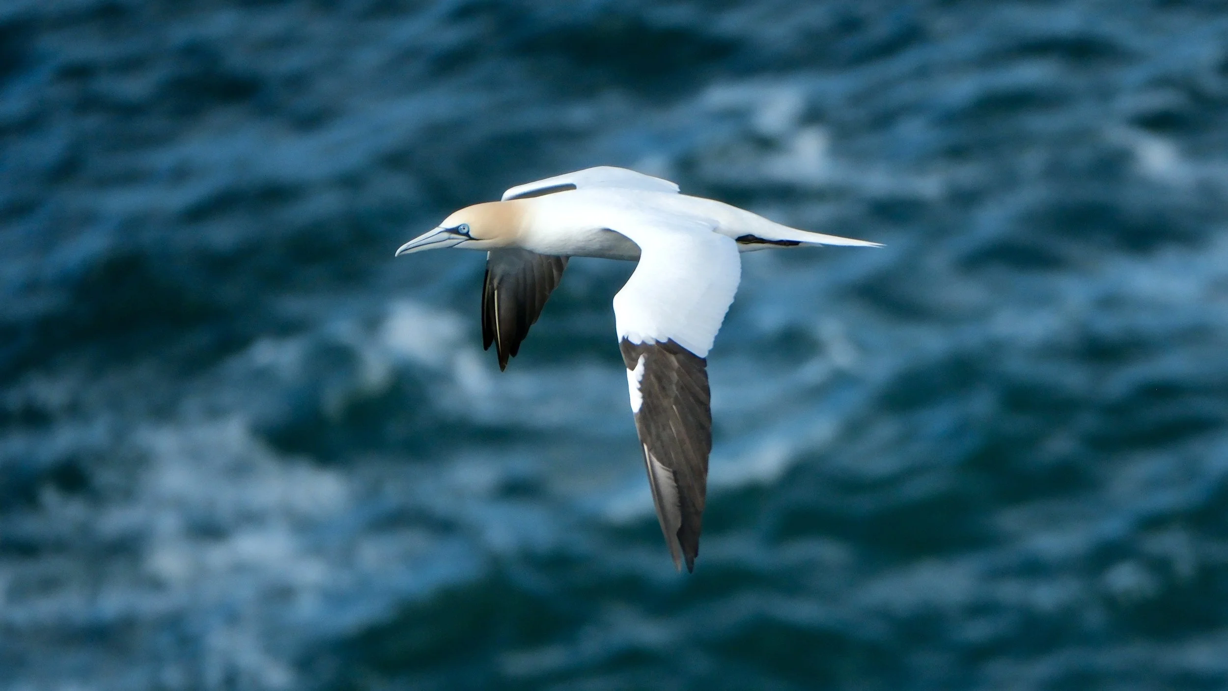 One of Britain’s largest seabirds, the adult Northern gannet is bright white with distinctive black wingtips and a yellow head. Its eye has a bright blue orbital ring with a pale blue‑grey iris. A gannet’s beak is long, strong and dagger‑like.